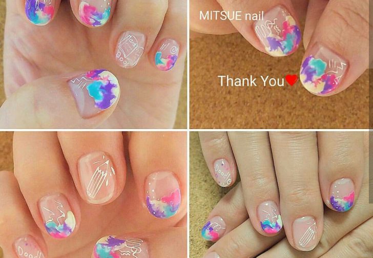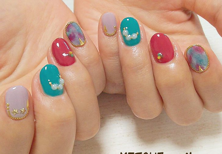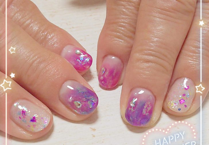 ピンクのシアーカラーとシアーオレンジを使ったマーブルネイ...