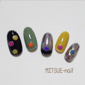 こちらは『ミラー感ネイル』ボタンとステッチを乗せた個性派ミラーネイルです!ミラーのイメージをちょっと変えたくて、あえてボタンにステッチのほっこりアートを合わせてみました。