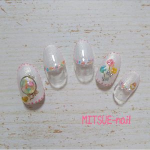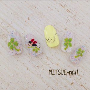 こちらは『ネイルデザイン春バージョン!』四葉のクローバーに、てんとう虫さんが楽しそうに飛び回っているイメージで作りました。可愛い♡